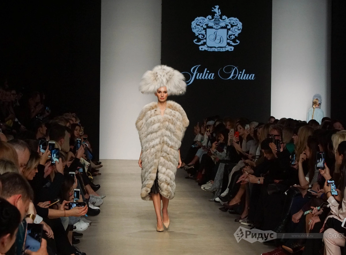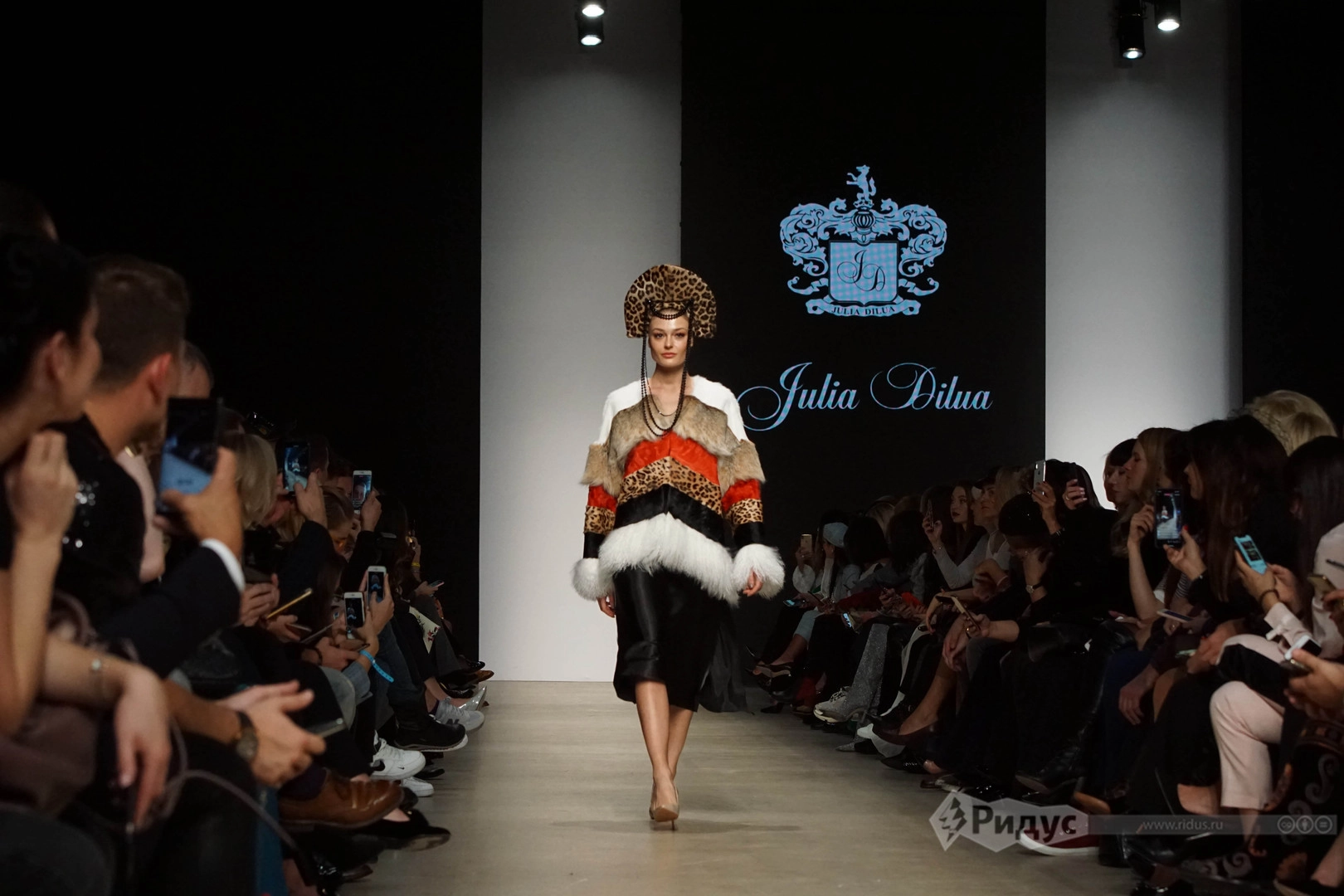 Показ дома моды Julia Dilua начался с настоящего сказочного зачина, затем на подиуме появилась мировая дива из Австралии Пирукуа, которая исполнила песню «Русская душа», а плавным переходом к дефиле стало выступление театра танца «Гжель». Обратившись к русской народной традиции, Джулия воплотила в своих изделиях русский фольклор и колорит. Не удивительно, что образ русского кокошника в том или ином виде присутствовал практически в каждом образце коллекции. Были представлены и нетипичные фасоны — бомберы и укороченные куртки. Каждый образ был завершен меховым головным убором — кокошником или ободком.