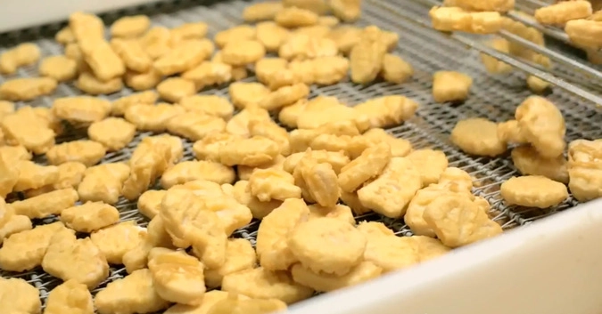 Для начала куриное мясо отделяют от костей и отправляют в гигантскую мясорубку. Полученный фарш попадает в специальную машину, которая делает из массы фарша наггетсы четырех официальных форм. В таком виде сырые наггетсы попадают на конвейер, поливаются тестом и запекаются. После этого они готовы к употреблению.
