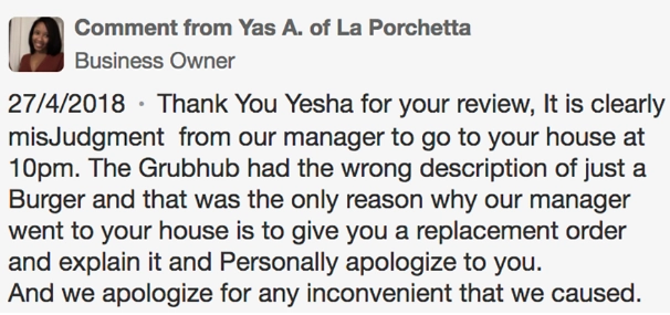 «Здравствуйте, это менеджер из „Ля Порчетты“. Я стою у вас за дверью и хотел бы обсудить ваш отзыв о нашем ресторане».