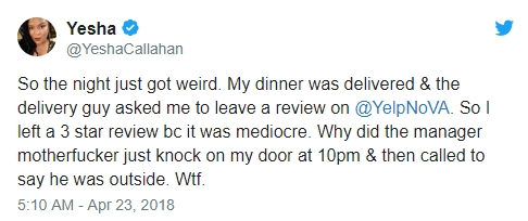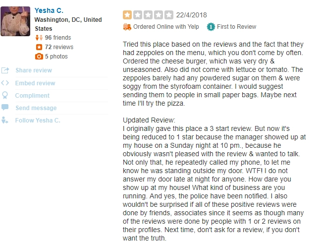 Йеша Каллаган из города Стерлинг, штат Вирджиния, имела неосторожность заказать доставку еды в местном ресторане «Ля Порчетта» и оставить о нем негативный отзыв. Посредственные вкусовые характеристики блюд оказались лишь меньшим из зол — ночью в дверь ее дома неожиданно постучался менеджер заведения.