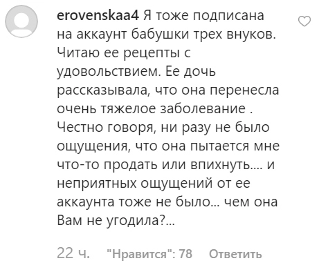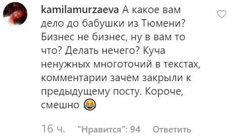 Сейчас комментарии к посту Ваенги о бабушке закрыты, но пользователи Сети все равно делятся своим мнением — в том числе в комментариях к другим постам. Многие из них выражают возмущение и пишут, что не понимают причину столь бурной реакции в адрес жительницы Тюмени. Они заступились за бабушку.