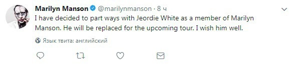 «Я решил расстаться с Джорди Уайтом как членом коллектива Marilyn Manson. В предстоящем туре он будет заменен. Я желаю ему всего хорошего», — написал Мэнсон на личных страницах в Twitter и Facebook.
