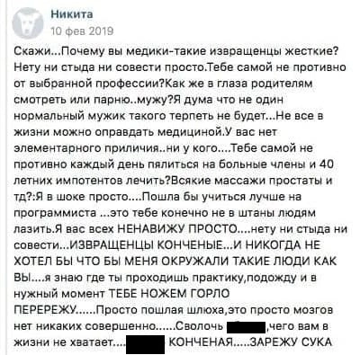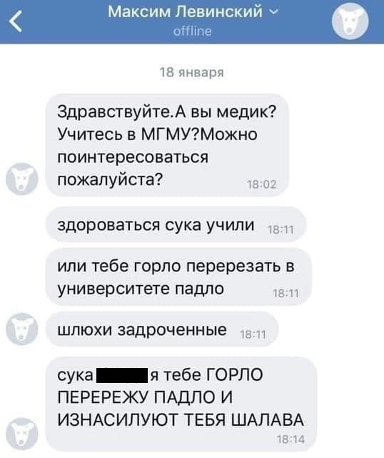 Анонимные пользователи писали девушкам с фальшивых аккаунтов, якобы пытаясь получить медицинскую консультацию. Узнав, что общается с девушкой-урологом, злоумышленник объявлял ее «извращенкой» и разражался потоком нецензурных оскорблений и угроз. Судя по опубликованным в сети скриншотам, особенно часто онлайн-террору подвергались студентки МГМУ имени Сеченова.