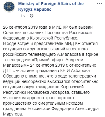 Обращено внимание, что в ходе телепередачи ведущий некорректно высказался относительно ситуации вокруг гражданина Киргизской Республики Исламбека Акбарова, ставшего участником ДТП со смертельным исходом гражданина РФ Александра Маругова, — говорится в сообщении министерства в Facebook.