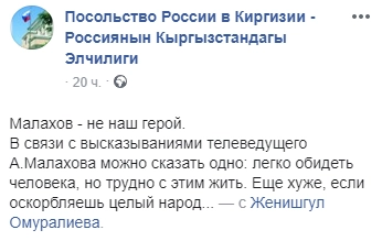 Ранее посольство РФ в Киргизии на официальной странице в Facebook осудило высказывание телеведущего.