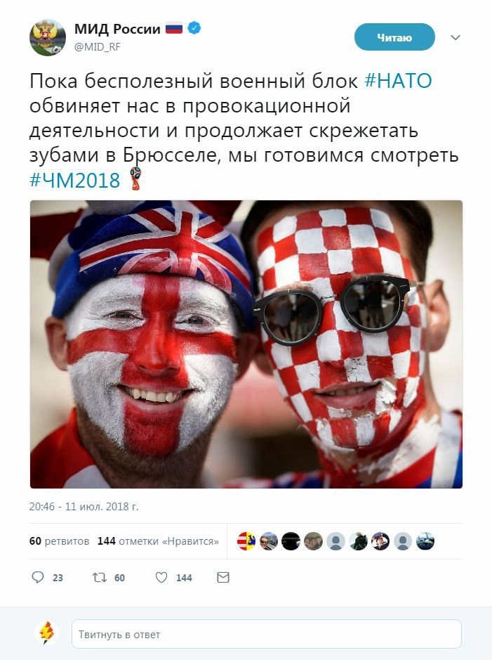 Ведущие официального Twitter Министерства иностранных дел России назвали Североатлантический альянс бесполезным военным блоком и ушли смотреть футбольный матч между Англией и Хорватией.