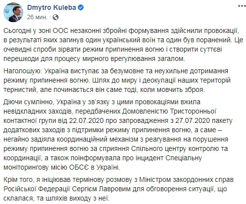 «Это — очевидные попытки сорвать режим прекращения огня и создать значительные препятствия для процесса мирного урегулирования в целом», — отметил Кулеба.