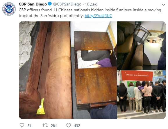 Пограничники остановили грузовик на въезде в Сан-Диего. При обыске они обнаружили 11 китайских мигрантов в «различных предметах мебели», в том числе в сундуке, комоде и стиральной машине.