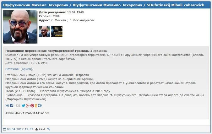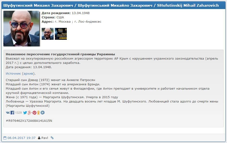 Певец, композитор, продюсер, заслуженный артист Российской Федерации Михаил Шуфутинский внесен в списки нарушителей украинского законодательства, которое запрещает посещать Крым иначе как с разрешения киевских властей. Музыкант побывал на полуострове в апреле 2017 года и теперь его данные опубликовал скандально известный сайт «Миротворец».