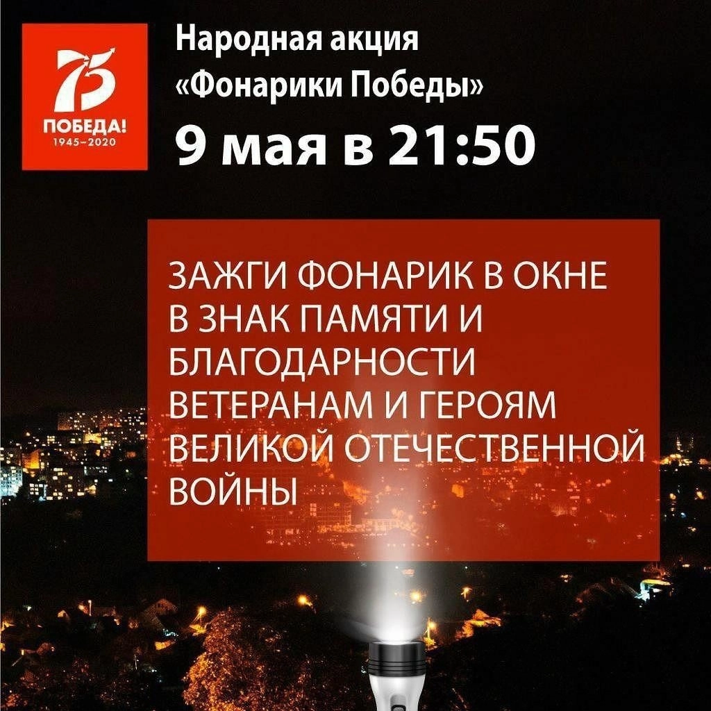 В праздник 9 Мая в 21:50 в России стартует акция «Свет Победы». Миллионы людей подойдут к окнам своих жилищ и зажгут фонарик или свечу в память о бойцах Красной армии, павших на фронтах Великой Отечественной войны.