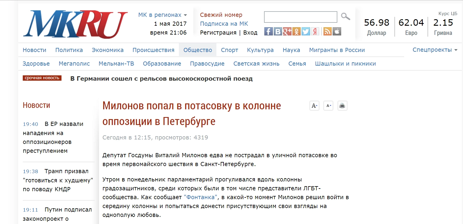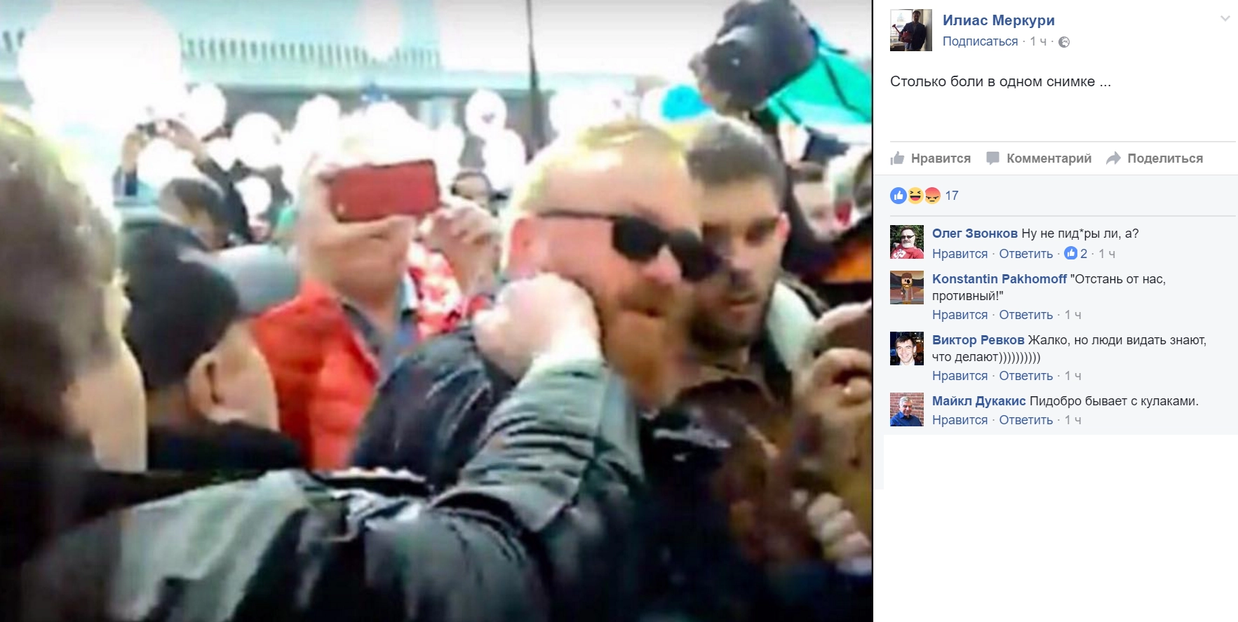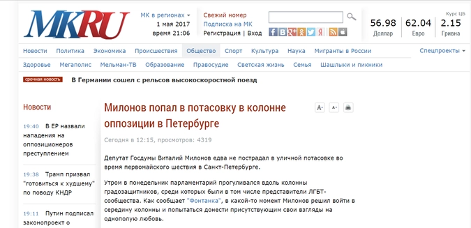 «Я присутствовал на первомайском шествии, в котором участвовали в том числе и представители петербургского ЛГБТ-сообщества… В общем, я немного завелся, поспорил… На этом, собственно, все и закончилось, — пояснил Милонов. — А потасовки никакой не было. Да и не могло быть. Акция очень хорошо охранялась полицией. И эти гомосексуалисты прятались за спинами полицейских».