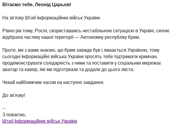 Ровно год назад, Россия, воспользовавшись нестабильной ситуацией в Украине, силой отобрала часть нашей территории — Автономную республику Крым. Однако, мы с вами знаем, что Крым всегда был и остается Украиной, поэтому сегодня Информационные войска Украины просят тебя поддержать крымчан, продемонстрировать солидарность с ними и поставить в социальных сетях аватар и кавер, которые мы подготовили и добавили к этому письму.