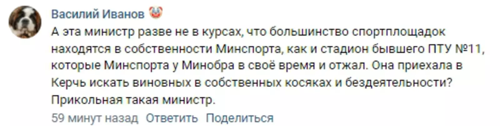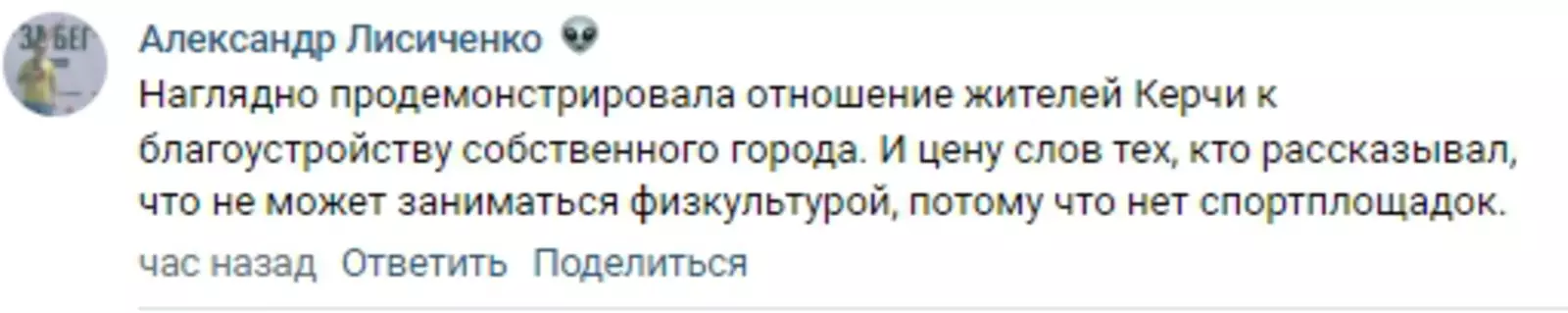 Вскоре снимок был удален из профиля министра, но успел разойтись по социальным сетям. Многие комментаторы в Рунете отметили, что, судя по снимкам спортплощадок из Керчи, слово из трех букв совершенно адекватно отражает их состояние.