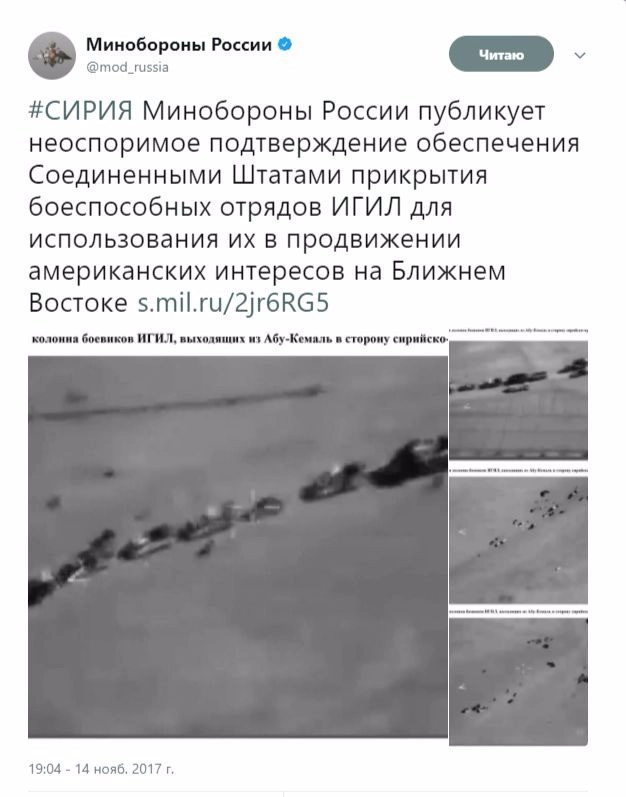 В нем также говорится о том, что отказ командования США наносить удары по колоннам террористов является объективным фактом, зафиксированным в стенограммах переговоров, и потому хорошо известным американской стороне. Также отмечается и активное противодействие американскими самолетами авиации ВКС России, которая была готова уничтожить боевиков, перегруппировывавшихся для новых атак на правительственные войска в районе Бу-Кемаля.
