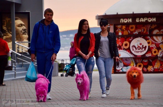 О спасении животных необычного окраса «Ридус» сообщал в конце июня этого года. В лесу под Геленджиком появились три самоедские собаки розового цвета — один взрослый пес и два щенка. Похожих собак ранее видели на набережной Геленджика. Предположительно, хозяева перекрасили их в яркий цвет для того, чтобы зарабатывать, фотографируя с ними всех желающих. Когда же псы стали им не нужны, они просто вывезли их в лес и оставили одних.