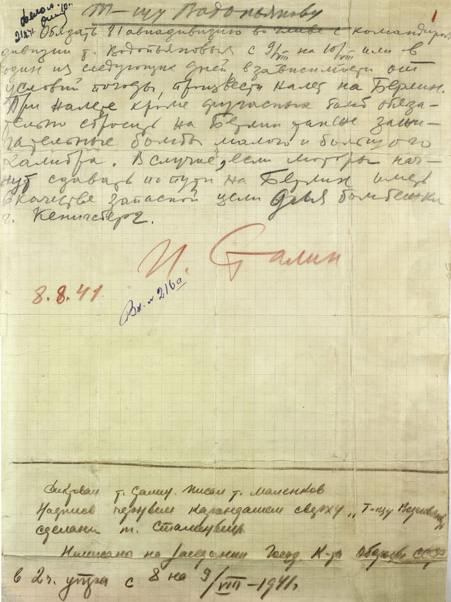 Можно ознакомиться, например, с копией рукописного проекта составленного под диктовку Сталина приказа Государственного комитета обороны СССР о бомбардировке Берлина. Документ, написанный в ночь с 8 на 9 августа 1941 года, обязывал командира 81-й авиадивизии нанести бомбовый удар по столице Третьего рейха.
