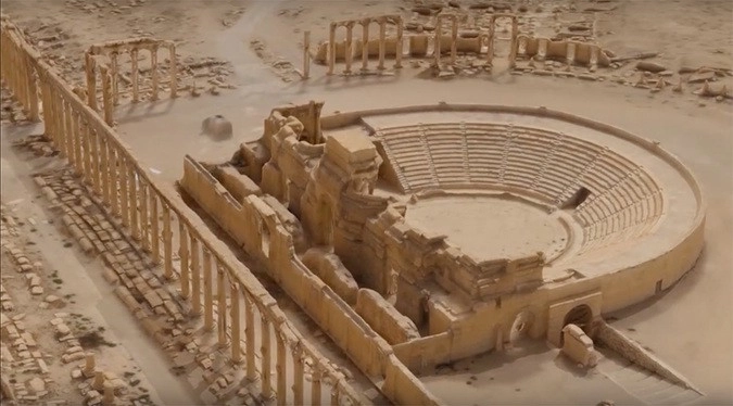 Во время мониторинга Пальмиры (Тадмор) и ее окрестностей российский беспилотник «зафиксировал факт варварского разрушения террористами ИГИЛ фасада римского амфитеатра и тетрапилона — главных достопримечательностей древнего города». На кадрах виден взрыв процениума — центральной части древнего римского театра, а также колонны тетрапилона — прямоугольного здания, возведенного еще в 270 году нашей эры.
