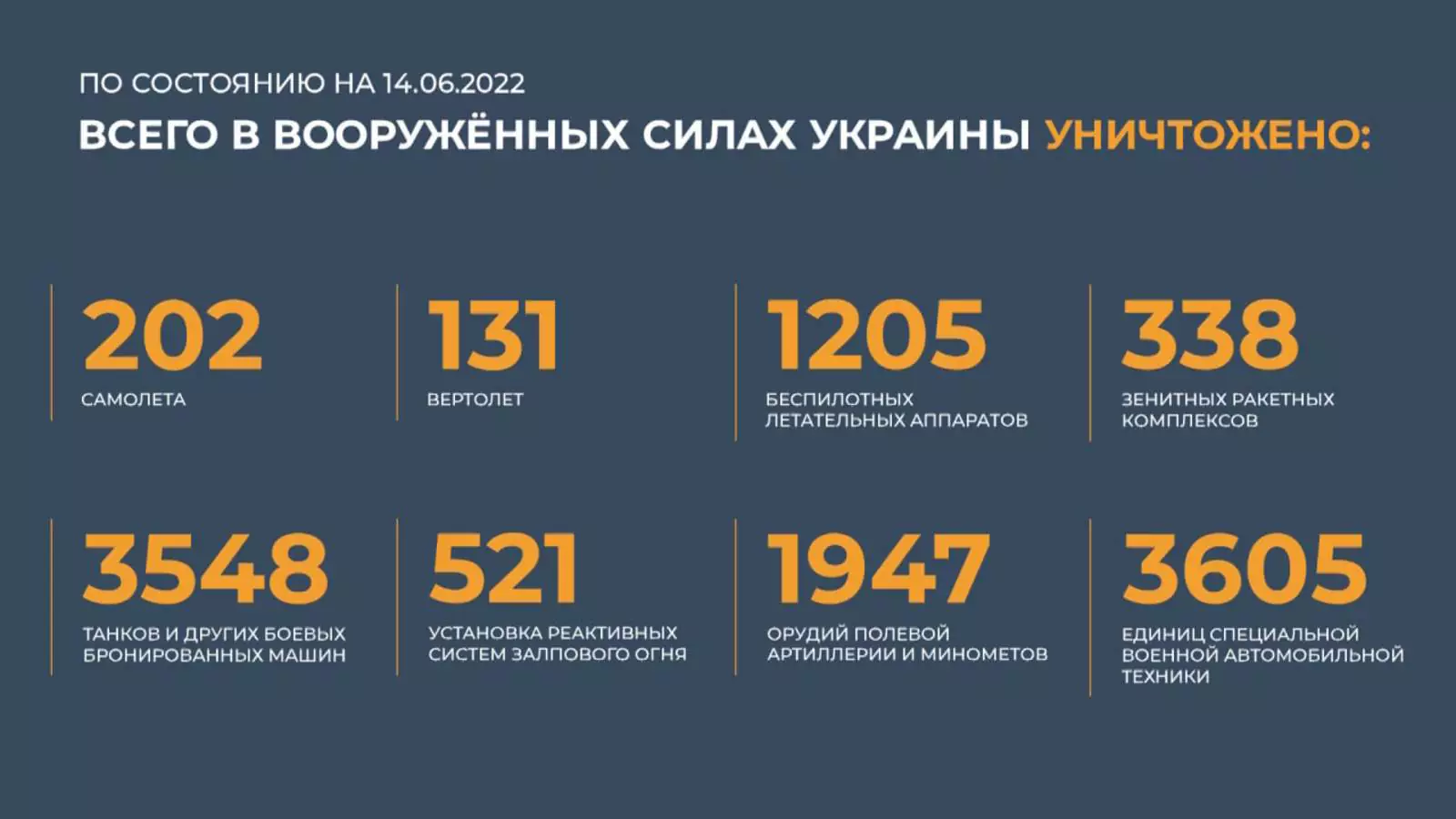 На данный момент в ходе спецоперации на Украине уничтожены 202 самолета, 131 вертолет, 1205 беспилотных летательных аппаратов, 338 зенитных ракетных комплексов, 3548 танков и других боевых бронированных машин, 521 установка реактивных систем залпового огня, 1947 орудий полевой артиллерии и минометов, а также 3605 единиц специальной военной автомобильной техники.