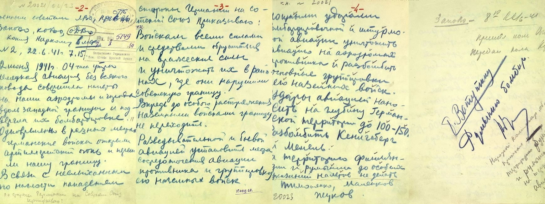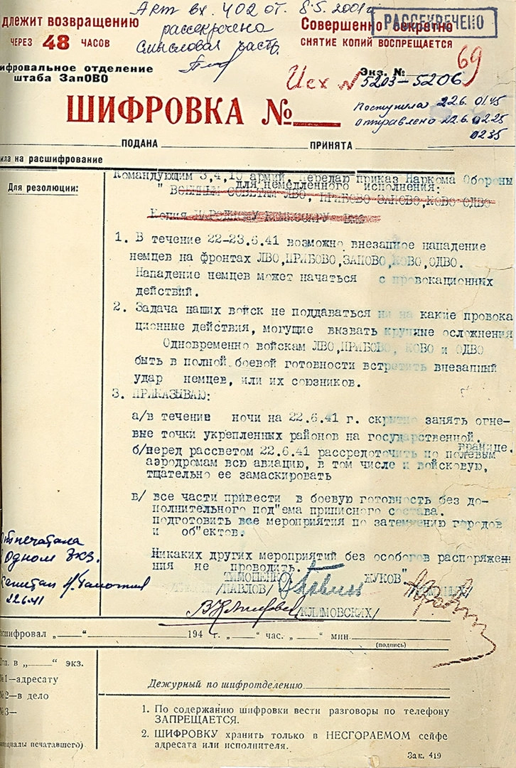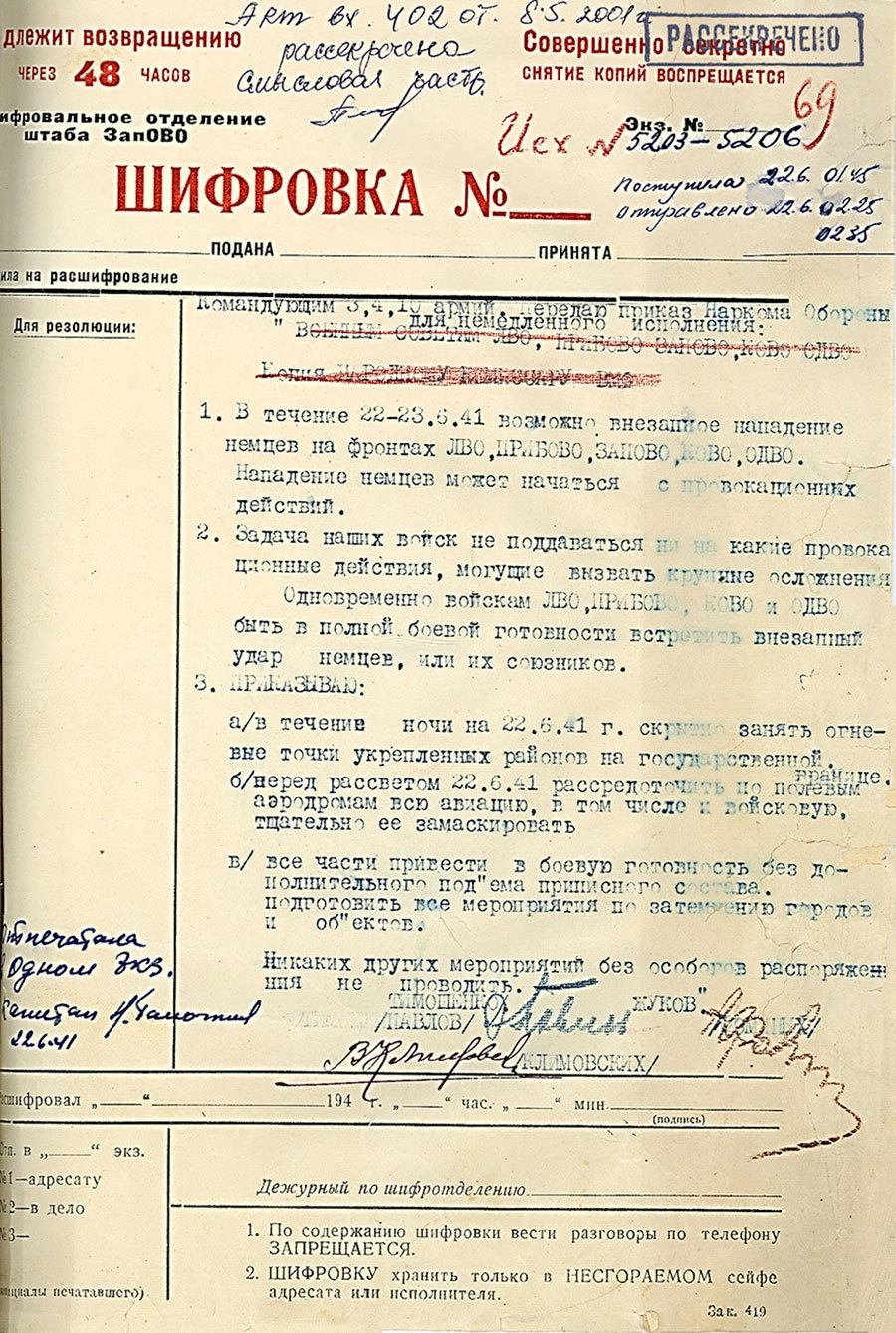 Самым известным из представленных документов является запоздалая директива народного комиссара обороны СССР Семена Тимошенко № 1 от 22 июня 1941 года, отправленная в 1:45 ночи и предписывающая советским войскам немедленно приготовиться к немецкому вторжению. Ввиду несовершенства средств связи командиры получили приказ с опозданием и не имели возможности его выполнить, так что в большинстве случаев гитлеровская авиация и передовые части вермахта застали Красную Армию врасплох. Уже в 4:00 без объявления войны фашистская Германия напала на Советский Союз, нанеся массированный удар по военным и стратегическим объектам и многим городам.