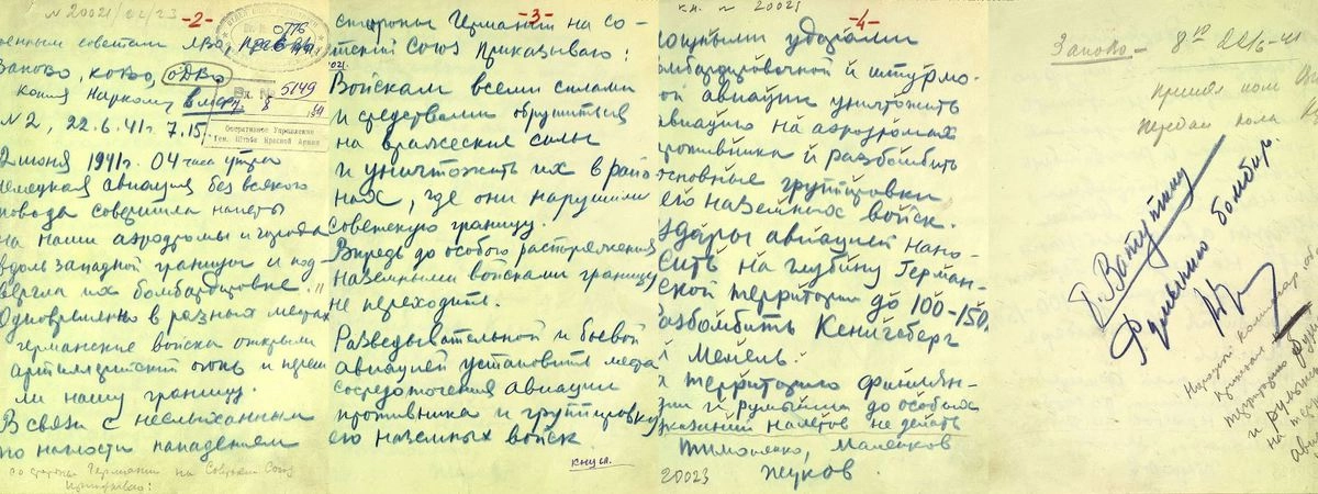 Внимания также заслуживает рассекреченная копия рукописного боевого приказа народного комиссара обороны № 2 от 22 июня 1941 года, собственноручно составленного начальником Генштаба РККА Георгием Жуковым спустя три часа после начала войны — в 7:15 утра.