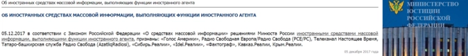 Кроме того, иноагентами признаны 7 проектов «Свободы» — телеканал «Настоящее Время», татаро-башкирская служба «Свободы», а также интернет-проекты «Фактограф», «Сибирь.Реалии», «Idel.Реалии», «Кавказ.Реалии», «Крым.Реалии».