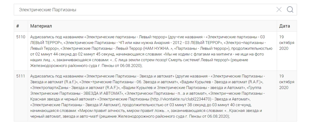 Железнодорожный районный суд Пензы по требованию Минюста признал экстремистскими песни «Левый террор» и «Звезда и автомат (R.A.F)», которые экс-участник группы ДДТ Вадим Курылев исполнил для своего сольного проекта «Электрические партизаны». Министерство внесло композиции в соответствующий список. По мнению властей, в них музыканты призывали к уничтожению системы.