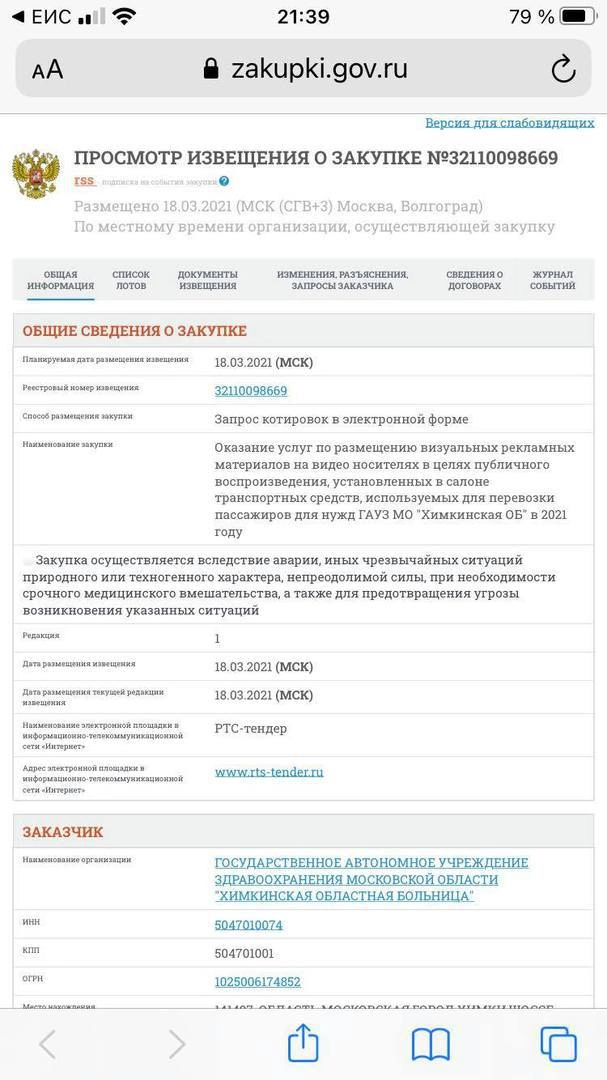 18 марта Химкинская областная больница разместила на сайте госзакупок заказ на «размещение визуальных рекламных материалов на видеоносителях, установленных в салоне транспортных средств» на сумму 521 448 рублей.