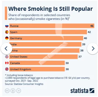 Между тем по результатам опроса, проводившегося немецкой компанией Statista с октября 2021 года по сентябрь 2022-го, оказалось, что Россия — самая курящая страна в мире. Около 46% россиян курят постоянно или периодически.