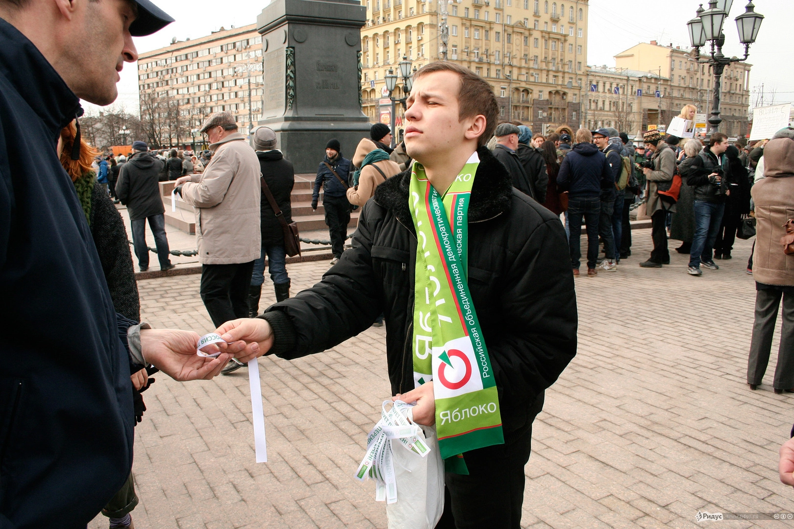 По ходу движения активисты пытались раздавать шагающим белые ленты. Брали их немногие. Большинство отказывалось. Кто-то молча, кто-то - с благодарностью. Были и такие, кто добавлял к слову "нет" нелицеприятные эпитеты в сторону либералов. Далеко не все участники акции разделяли их идеи.