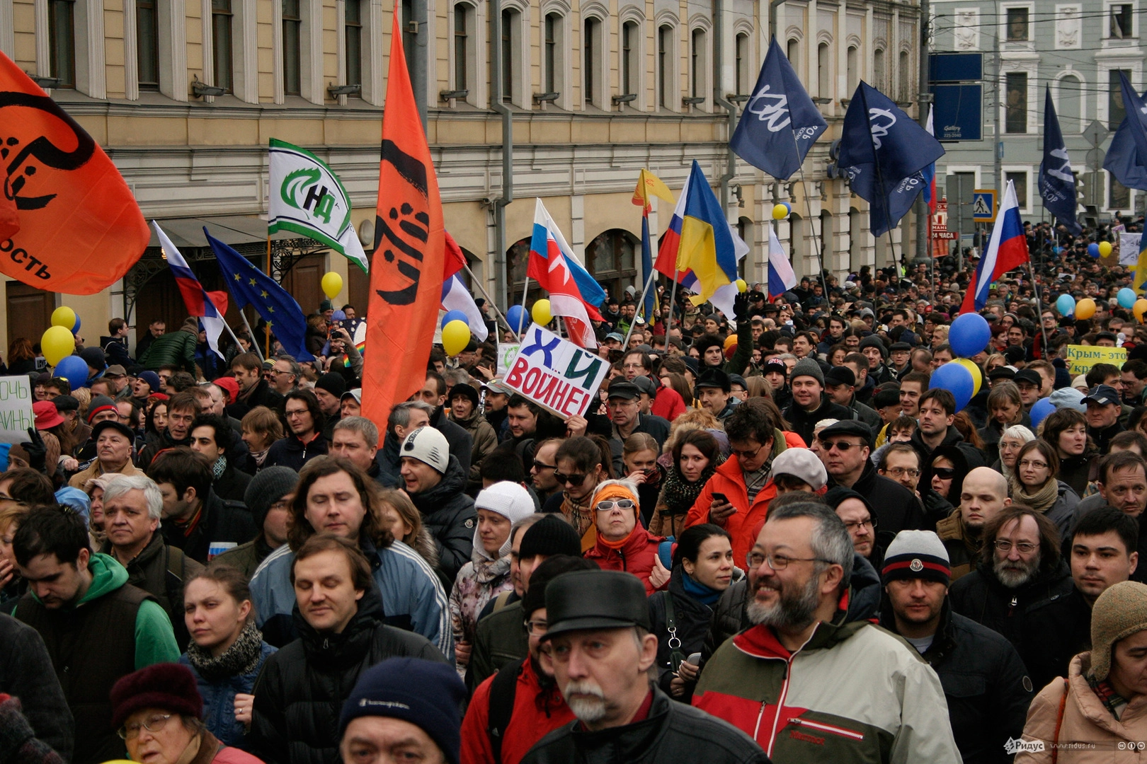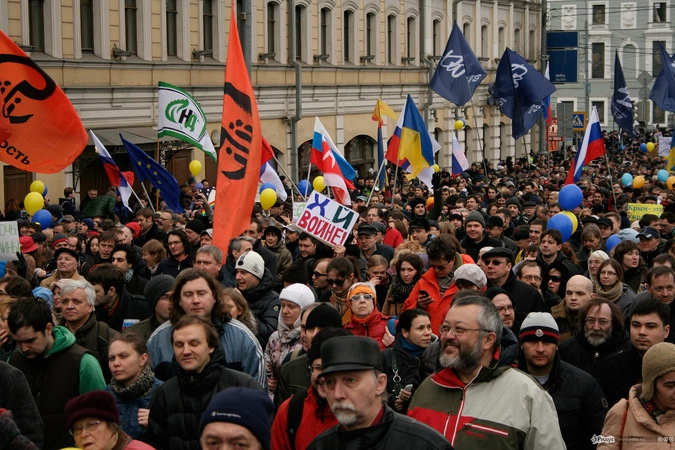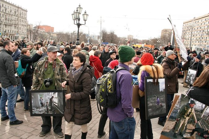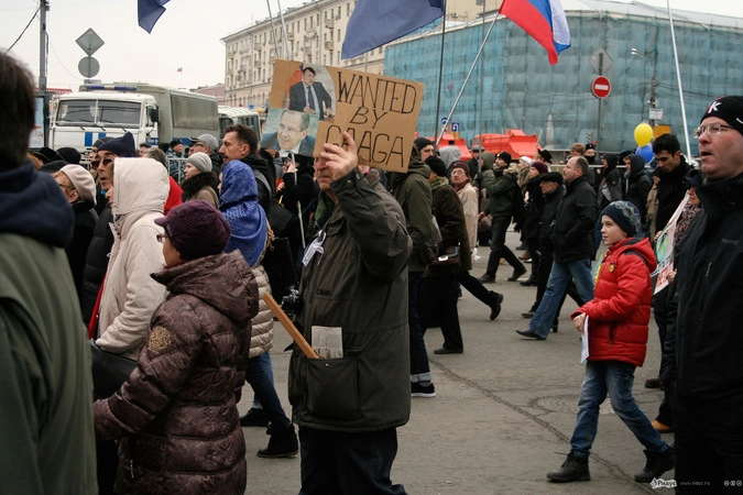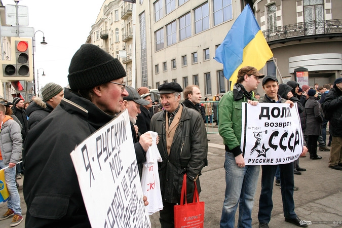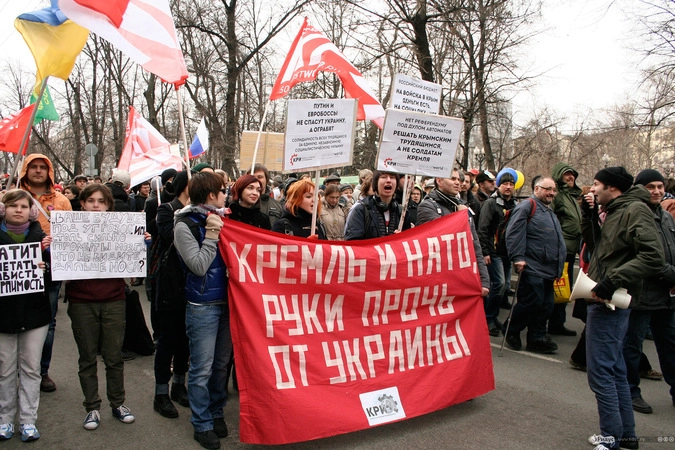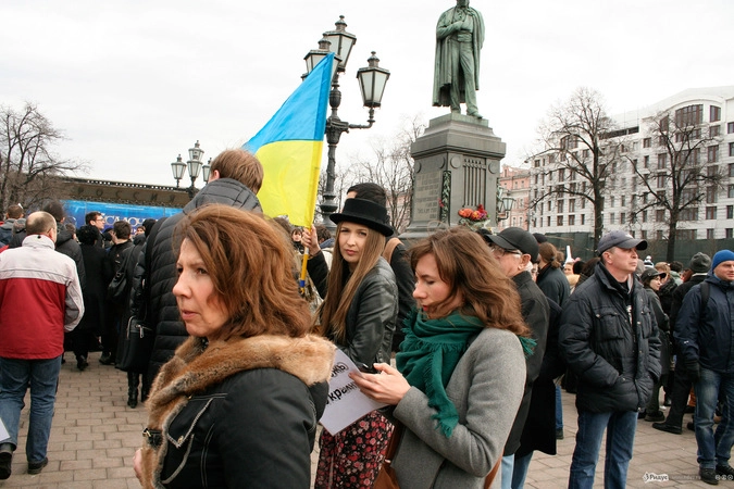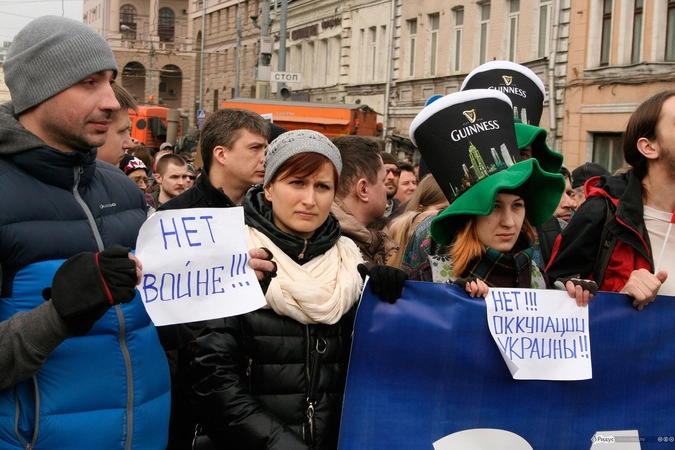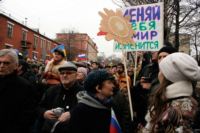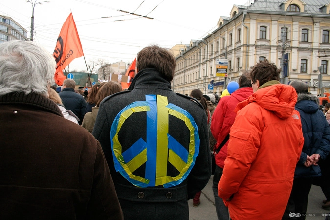 Мотивы для посещения мероприятия у людей были слишком разные. Позитивные "олдовые хиппи" традиционно маршировали за мир во всём мире. Представители оппозиционного движения чередовали новомодные украинские лозунги с уже набившими оскомину жуликами да ворами. Надо отметить, стандартные "болотные" призывы преобладали. Всё-таки, своя рубашка ближе к телу, внутренняя политика либералов заботит значительно больше судеб братьев-украинцев, на марш в защиту которых они вышли.