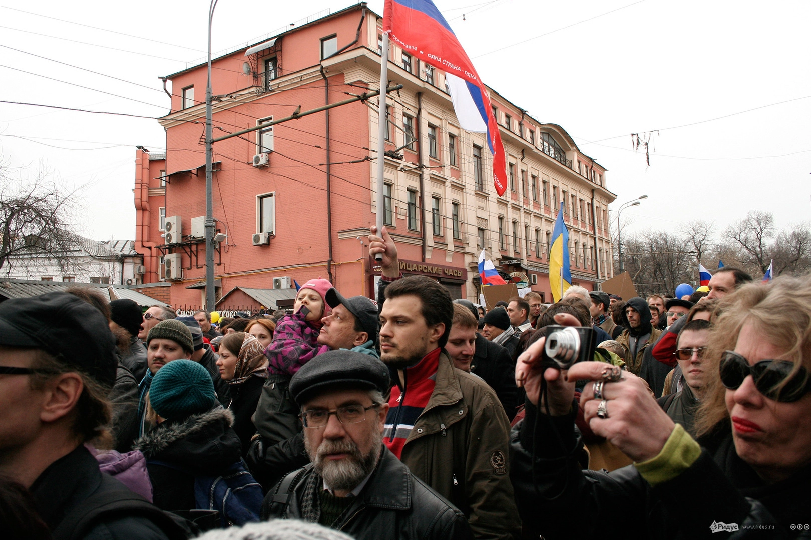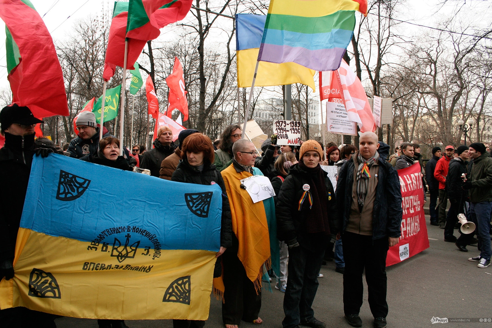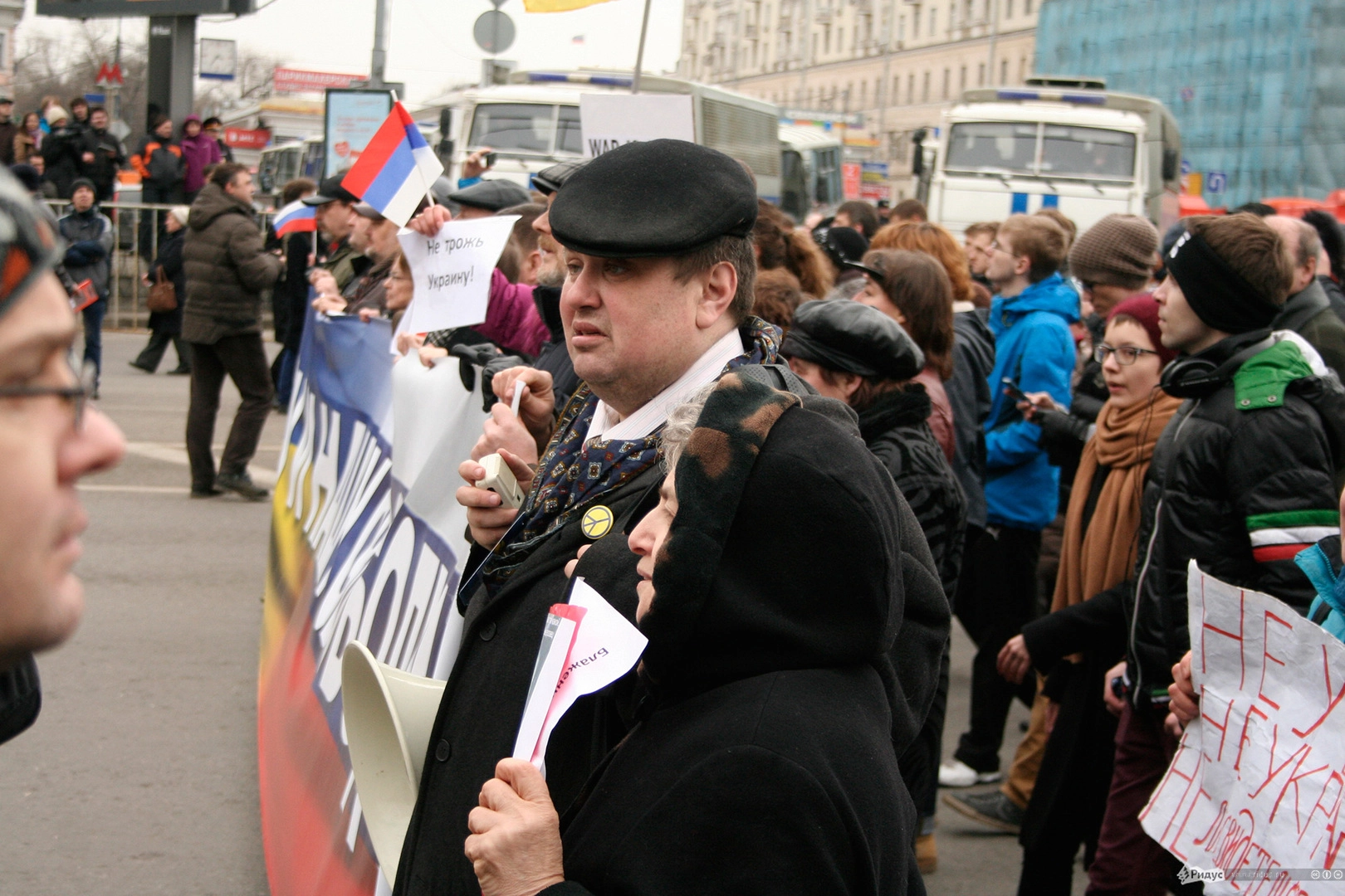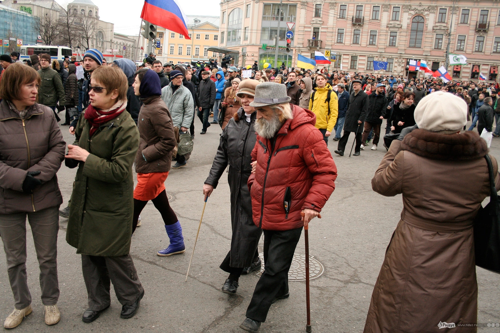 Мотивы для посещения мероприятия у людей были слишком разные. Позитивные "олдовые хиппи" традиционно маршировали за мир во всём мире. Представители оппозиционного движения чередовали новомодные украинские лозунги с уже набившими оскомину жуликами да ворами. Надо отметить, стандартные "болотные" призывы преобладали. Всё-таки, своя рубашка ближе к телу, внутренняя политика либералов заботит значительно больше судеб братьев-украинцев, на марш в защиту которых они вышли.