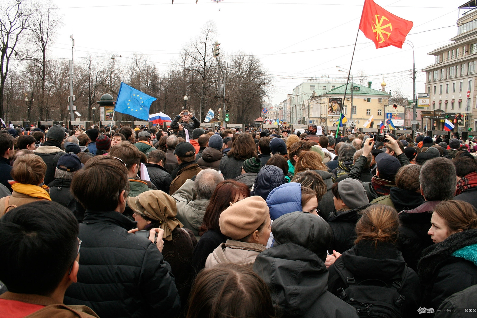 Некоторых участников шествия напрягло присутствие колонны под радужными флагами. "Крым с нами! Мы - в ваших рядах!" - эти лозунги сторонников однополой любви вызвали самые настоящее протестное напряжение внутри самой колонны. "Это с кем вы, с нами, три-два-рас-ы, - допытывался у них крепкий парень. - Жованый крот! Щука, брат! Валите отсюда!" Впрочем, подобные бесплатные выступления происходят на многих оппозиционных акциях.