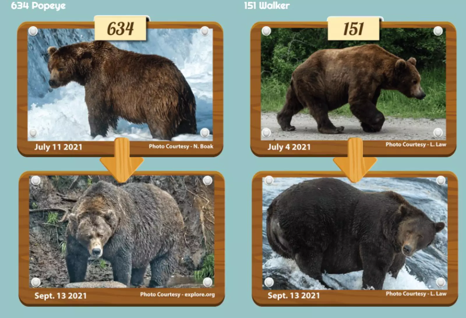Также на официальном сайте конкурса можно прочитать биографию медведей, обитающих в парке Катмай, и увидеть их летние фотографии, на которых они были стройными и подтянутыми, а также недавние осенние снимки, где мишутки уже стали толстячками.