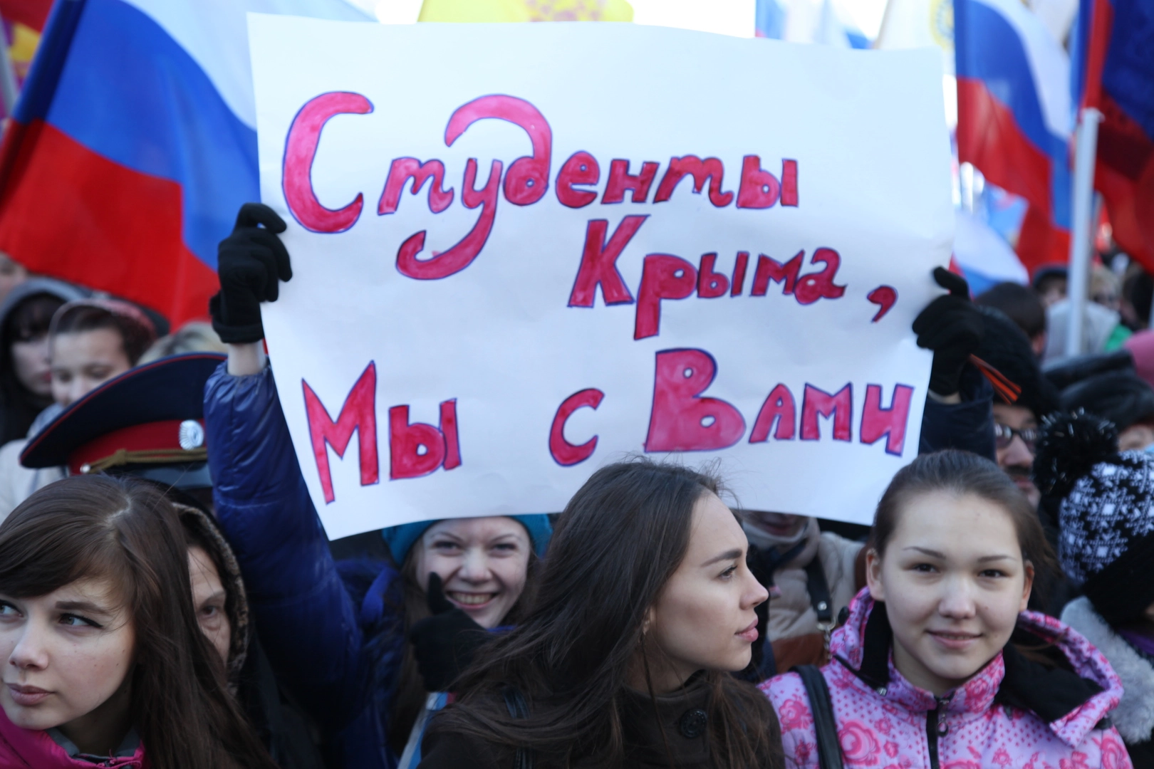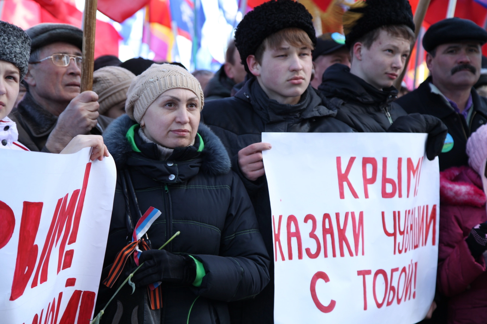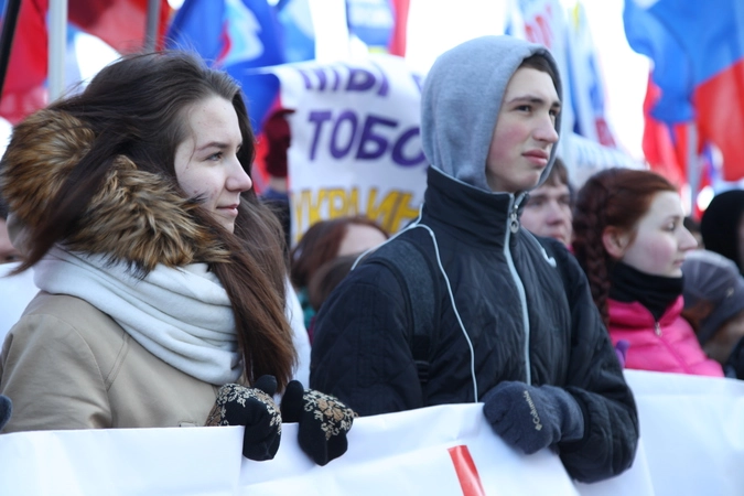 У многих из тех, кто пришел сегодня на Красную площадь, есть родственники на Украине. А жизнь близких в новых условиях, не может их не волновать. Поэтому антифашистские лозунги стали одними из главных на прошедшем сегодня митинге. Многие из пришедших были с георгиевскими ленточками. Участники поддержали решение крымского парламента о воссоединении с Россией.
