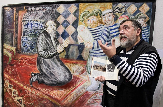Участник арт-группы "Митьки" Дмитрий Шагин представляет свое полотно "Митьки приносят Ивану Грозному нового сына" в арт-центре "Митьки-Арт" в Санкт-Петербурге. © Анатолий Медведь/РИА Новости
