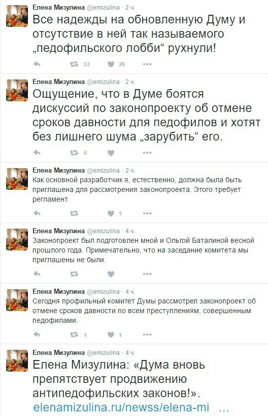 Все надежды сенатора Елены Мизулиной на то, что в Думе не окажется «педофильского лобби», рухнули. Об этом сама сенатор написала в своем микроблоге Twitter.