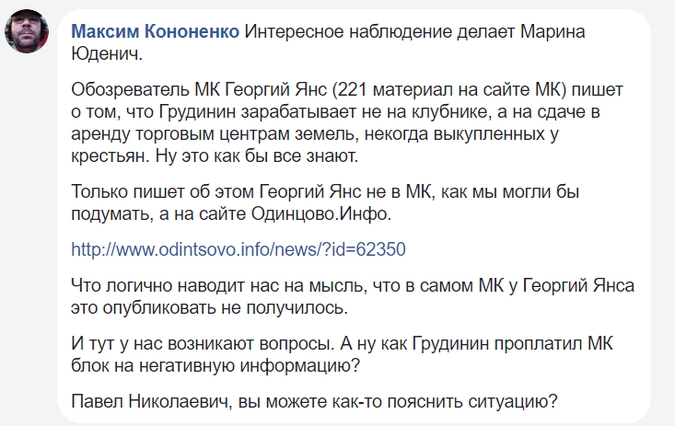 Примечательно, что материал Георгия Янса был опубликован в «МК» не сразу. Изначально он появился в издании «Одинцово.инфо». Внимание на отсутствие в «Московском комсомольце» статьи со знакового мероприятия от штатного журналиста издания обратила публицист Марина Юденич: «Что логично наводит нас на мысль, что в самом „МК“ у Георгия Янса это опубликовать не получилось. И тут у нас возникают вопросы. Павел Николаевич, вы можете как-то пояснить ситуацию?»