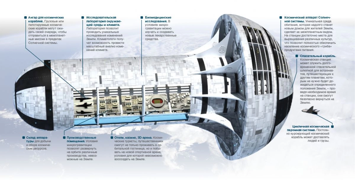 Помимо научных лабораторий и исследовательских центров, на космической станции будет много культурно-развлекательных комплексов. Например, казино, мини-кинотеатр, библиотека и отель.