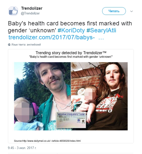 На такой записи настоял родитель ребенка, трансгендер Кори Доти, который не позиционирует себя ни как женщину, ни как мужчину, а по отношению к себе и младенцу использует местоимение «они». Он пообещал, что будет воспитывать Сирила таким образом до тех пор, пока тот сам не определится со своей гендерной принадлежностью.