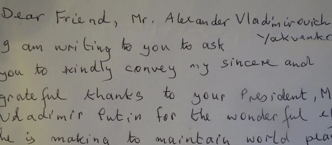 «Дорогой друг, мистер Александр Владимирович Яковенко (посол России в Лондоне. — прим. „Ридуса“), я пишу вам, чтобы выразить искреннюю благодарность вашему президенту Владимиру Путину за усилия, которые он предпринимает для того, чтобы поддерживать мир на Земле».