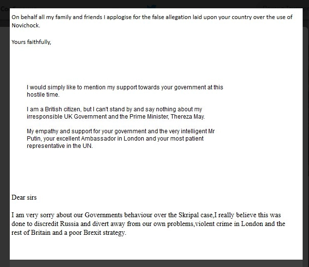 «Уважаемые господа! Я очень сожалею о поведении правительства по поводу случая со Скрипалем. Думаю, это было сделано, чтобы дискредитировать Россию в глазах мирового сообщества и отвлечь нас от собственных проблем, преступлений в Лондоне и всего остального, от провальной стратегии Brexit».