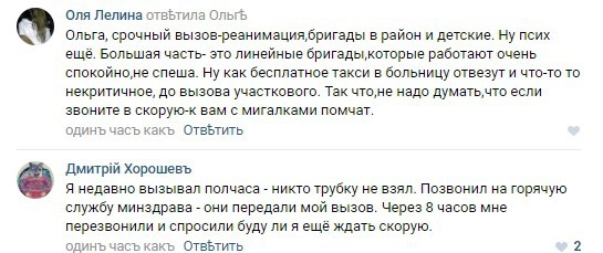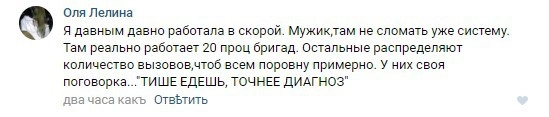 Пользователи Рунета неодобрительно отозвались о работе сотрудников скорой помощи и рассказали о подобных ситуациях из личного опыта. Некоторые люди наоборот пожалели медиков, пояснив, что многие «вызывают скорую по мелочам», бригад в городе недостаточно, поэтому врачи «зашиваются на работе» и все равно не успевают приехать вовремя на все вызовы.