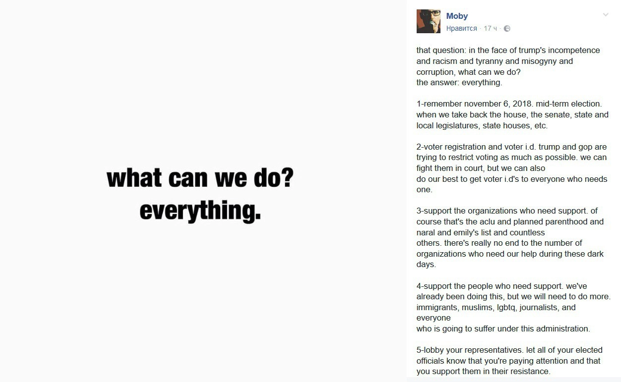 Несмотря на наличие «неопровержимой информации, которая приведет к импичменту», простым американцам тоже не стоит сидеть сложа руки. Спустя час после сообщения о заговоре мировых спецслужб, Моби расписал план действий для обычных избирателей: объединяться, бойкотировать, протестовать, поддерживать и так далее. Опять же по пунктам.
