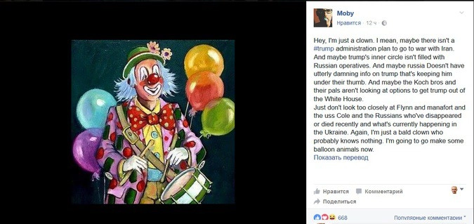 «Эй, я же просто клоун. Я Имею в виду, что, возможно, администрация Трампа не планирует начать войну с Ираном. Возможно, ближайшее окружение Трампа не наполнено русскими агентами. Возможно, у России нет компромата на Трампа, позволяющего держать его на привязи. Возможно, братья Кох и их дружки не прикидывают варианты, как вышвырнуть Трампа из Белого дома», — написал музыкант, добавив с явной грустью: «Я просто лысый клоун, который, возможно, ни черта не знает. Пойду делать животных из воздушных шариков».
