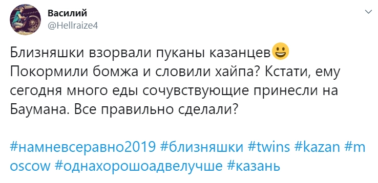В Казани модели-близняшки сняли видео, как они кормят мужчину без определенного места жительства. Ролик вызвал общественный резонанс.