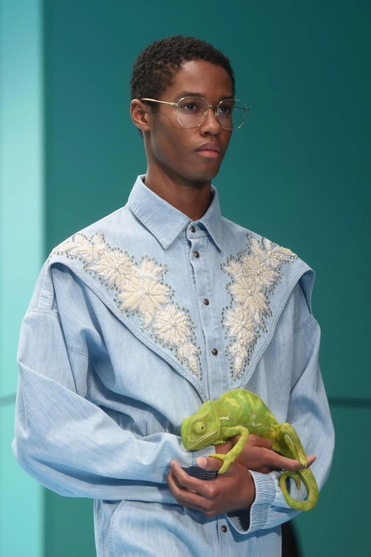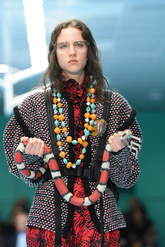 Модные новинки марки Гуччи продемонстрировали и другие жуткие создания. По подиуму ходила девушка с третьим глазом во лбу, парень с рогами и модели с драконом, змеёй и хамелеоном в руках.