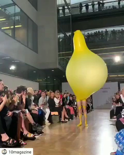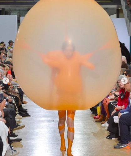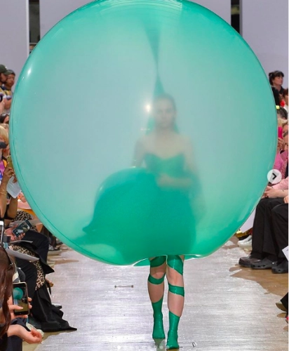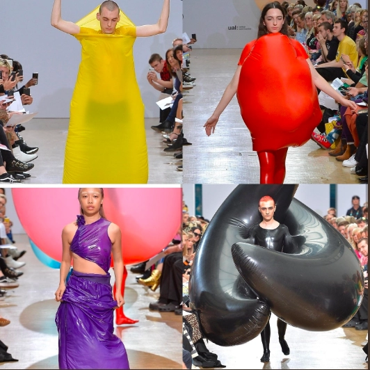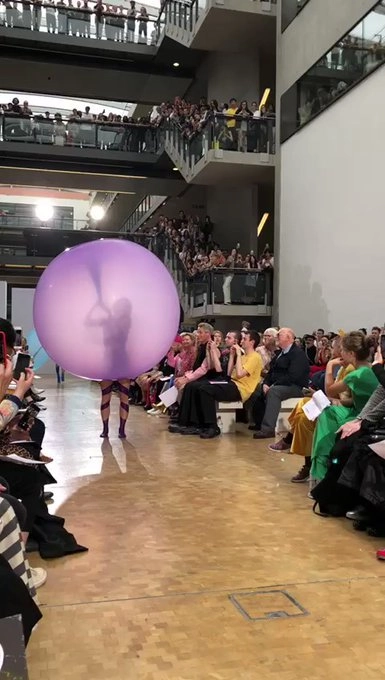 В соцсетях стало популярным видео с модного показа скандинавского дизайнера Фредрика Тьерандсена (Fredrik Tjaerandsen), который состоялся в Британии в рамках конкурса L’Oreal Young Talent Awards. Модели вышли на подиум в гигантских воздушных шарах, которые вскоре сдуваются и превращаются в своеобразные костюмы.