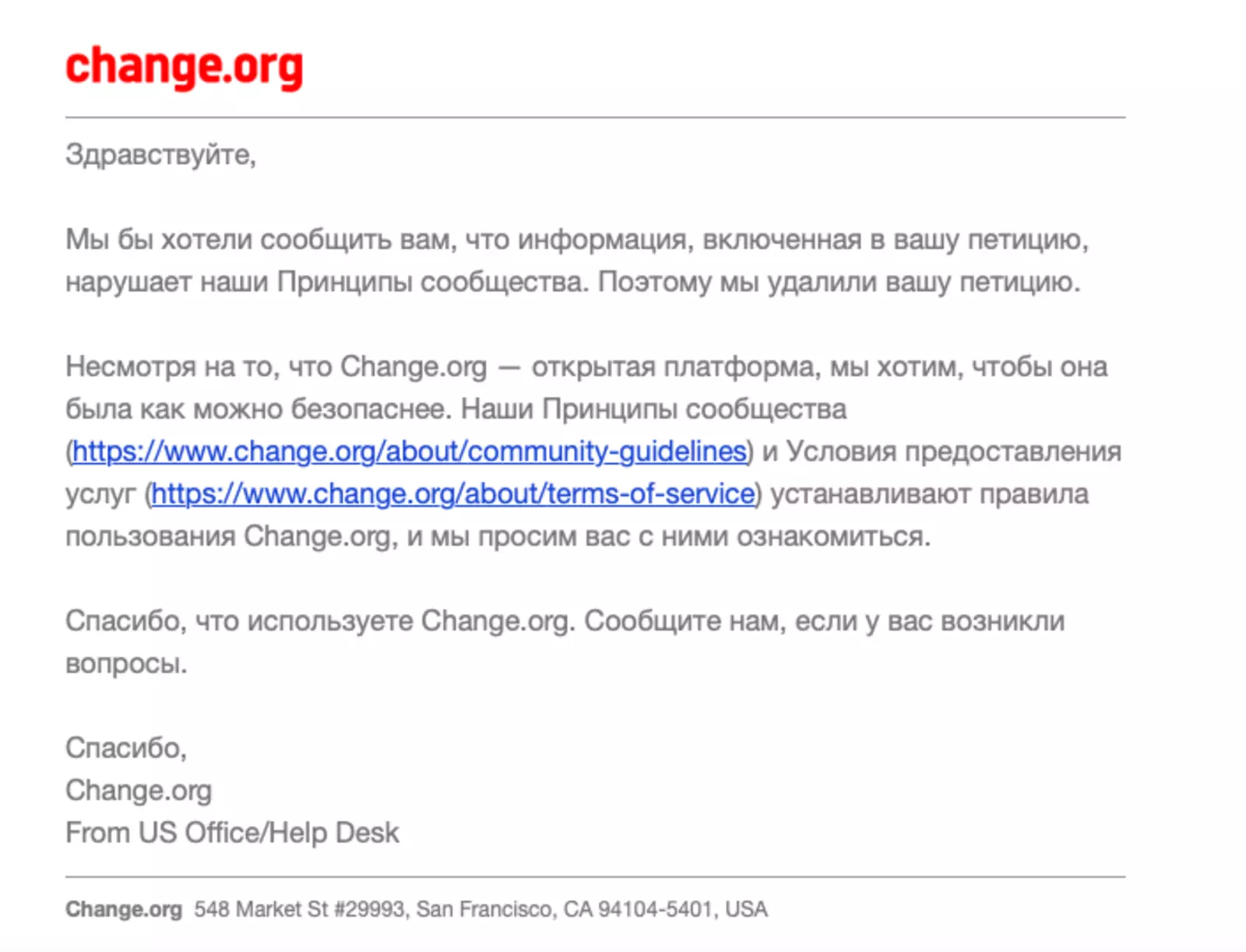 Модераторы, к сожалению, не объяснили, по какой причине был удален документ. Вероятно, они решили, что петиция, как указано в правилах Change.org, «напрямую или косвенно атакует целое сообщество людей», поскольку в тексте документа полк «Азов» был назван неонацистским.