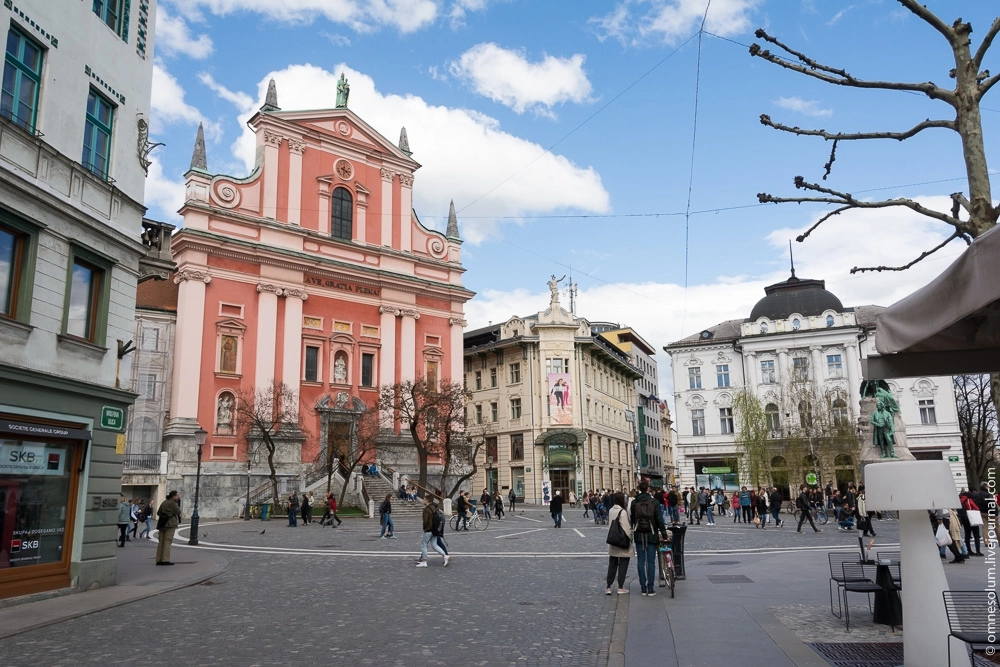 Рядом на площади Прешерна притягивает к себе взгляды розовый фасад церкви Благовещения. Здание было построено в XVII веке монахами-августинцами, но затем перешло к францисканскому ордену. Фасад украшен медной статуей Богородицы, а в западном крыле находится библиотека, в которой хранятся тысячи старинных рукописей.