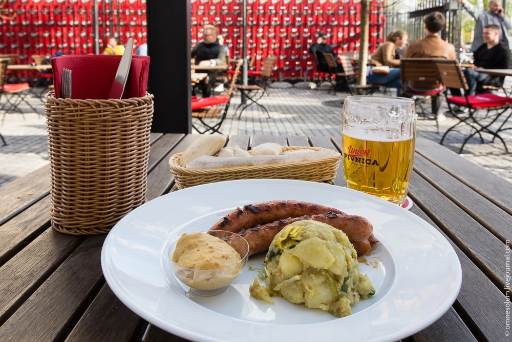 В местном баре я сначала не разобрался, где стоит записываться на экскурсию по заводу, поэтому погулял в одиночестве по зданию и только на последнем этаже встретил девушку-экскурсовода, которая сообщила мне, что ближайший тур будет только через час. Чтобы не терять время зря, я заказал себе пол-литра пива и сосиски с картофельным салатом, разместился в биргартене и прекрасно поужинал.